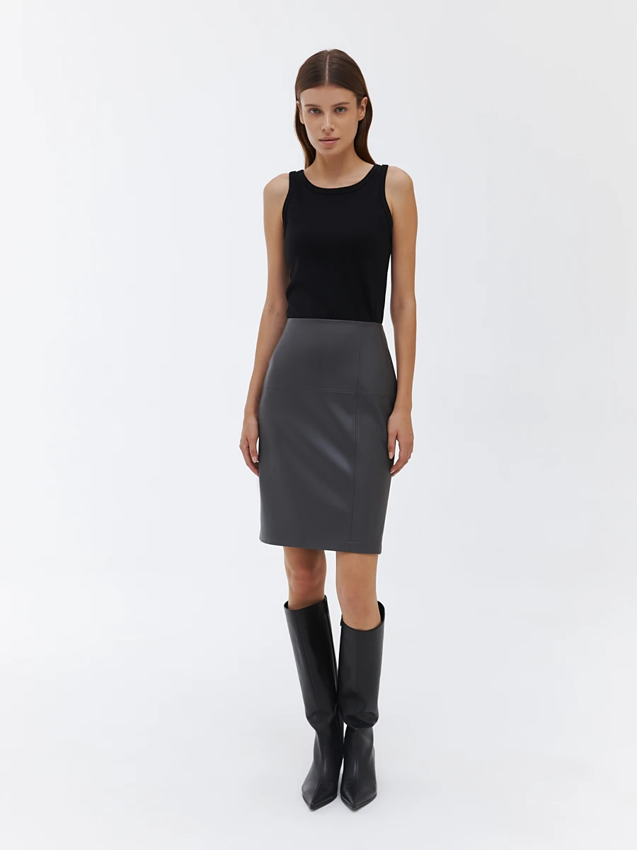 Элегантная юбка-карандаш из экокожи в трендовом графитовом оттенке станет незаменимой основой стильных базовых образов. Модель выполнена из плотной переливающейся ткани премиального качества. Спереди и сзади проходят декоративные швы, которые создают интересные акценты. Благодаря высокой посадке и вытачкам на бедрах юбка гармонично подчеркивает фигуру и создает правильные пропорции. Универсальная длина чуть выше колена комфортно носится и отлично впишется в любой дресс-код.