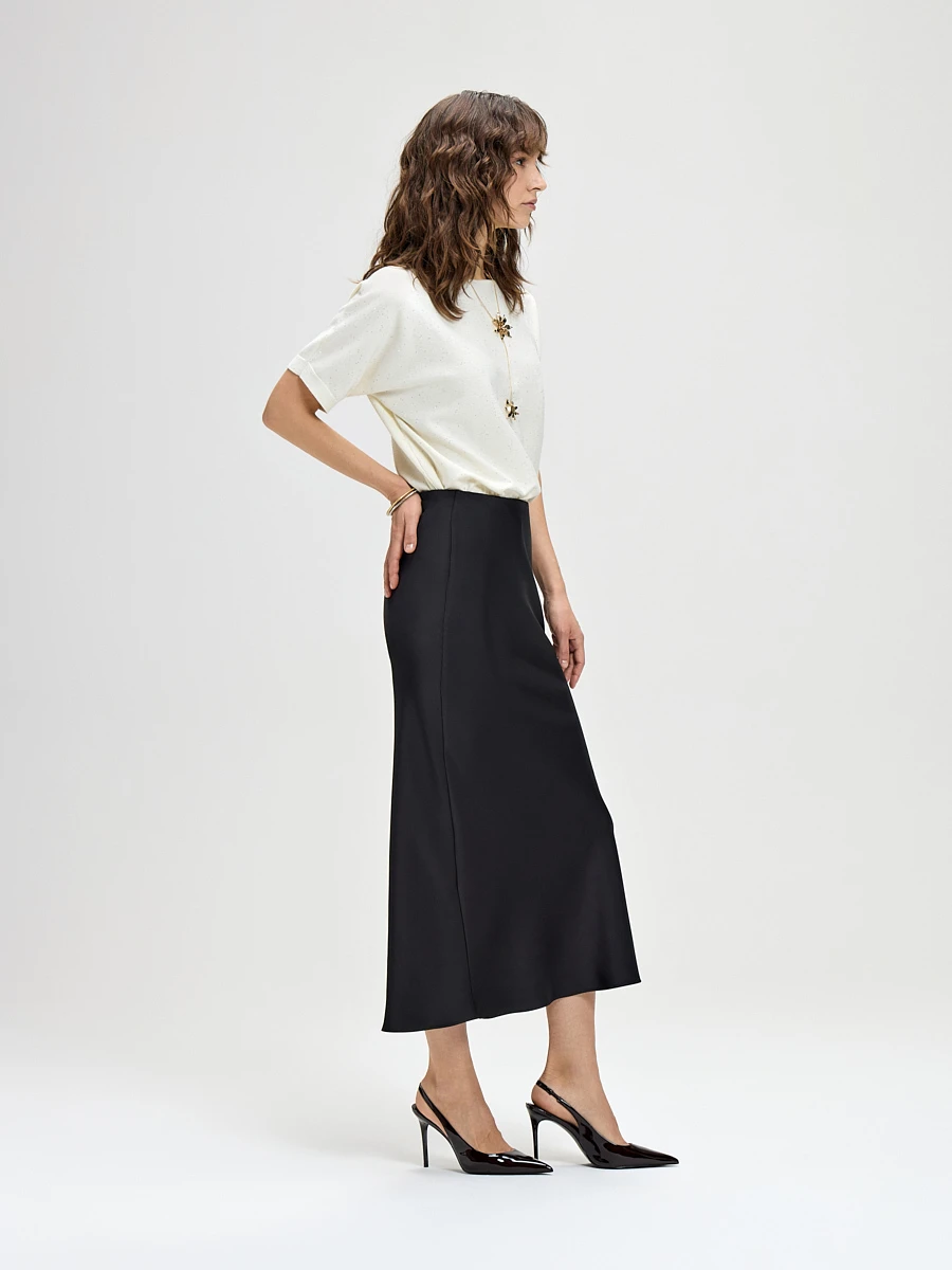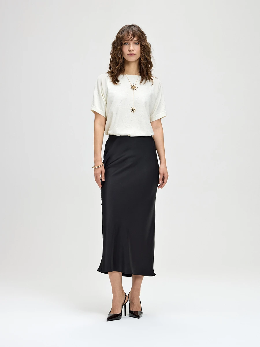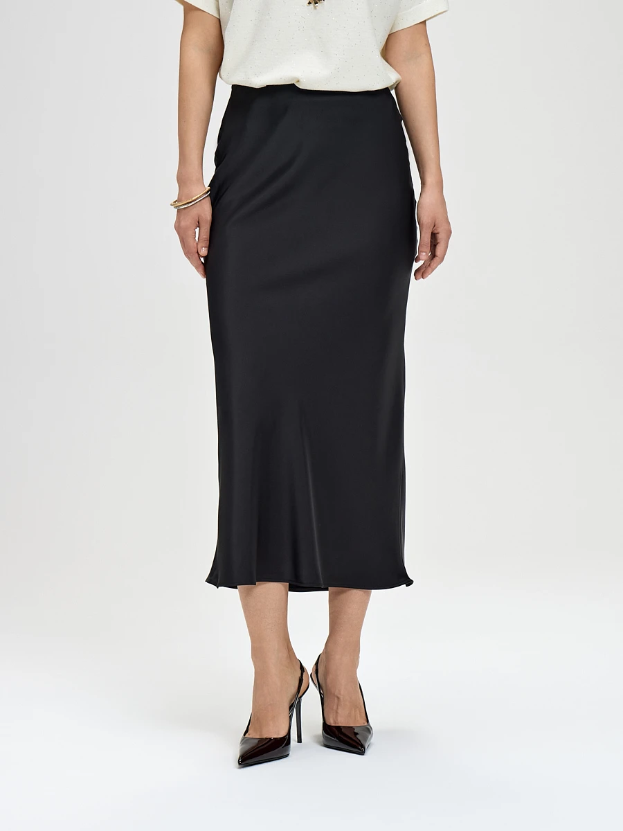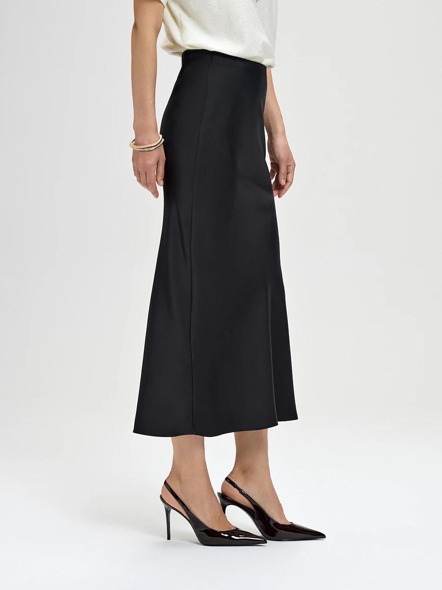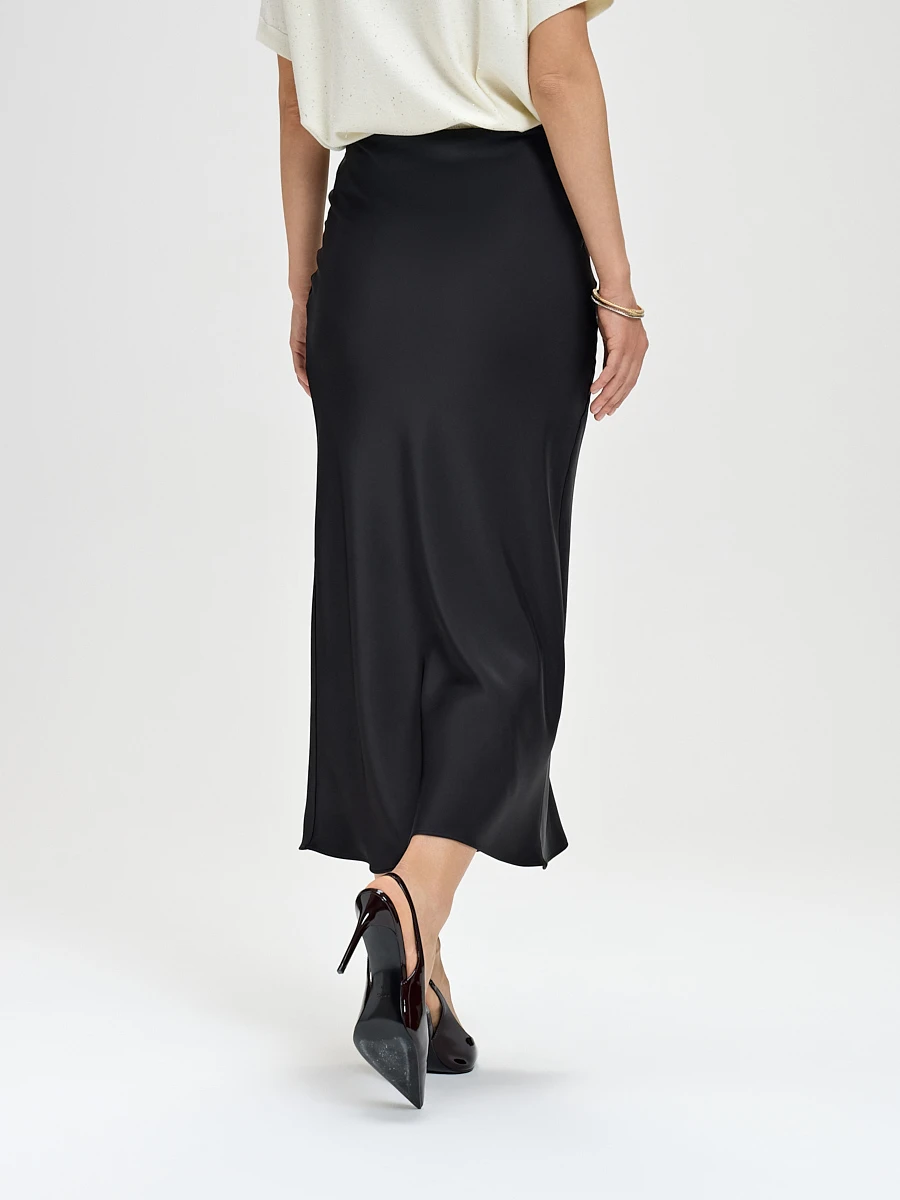 Струящаяся юбка миди черного цвета — это воплощение утонченной женственности и спокойной элегантности. Мягкие складки и невесомый силуэт создают ощущение легкости и движения. Классический черный цвет делает её идеальной базой для создания как капсульного гардероба, так и ярких образных сочетаний.