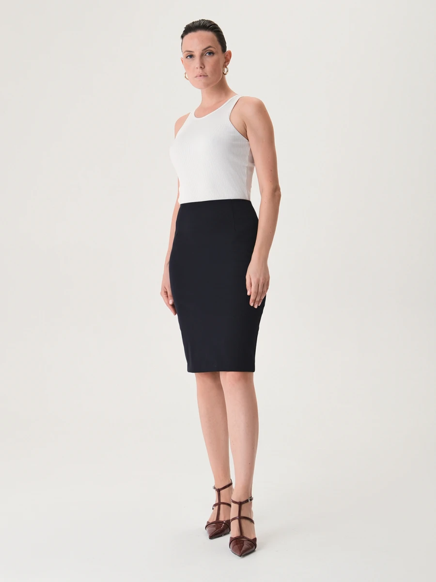Классическая юбка-карандаш в глубоком темно-синем цвете гарантировано станет незаменимой единицей базовых образов. Высокая посадка с акцентом на талии и вытачки на бедрах создают гармоничный силуэт «песочные часы». Универсальная длина до колен с легкостью впишется в любой дресс-код, будь то официальный деловой стиль или поход на вечернее мероприятие. Сзади расположен аккуратный разрез и потайная молния.