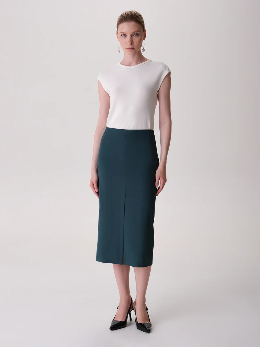 Юбка-карандаш в темно-бирюзовом цвете вдохнет в ваши образы новую жизнь. Трендовый глубокий оттенок выигрышно сочетается как с темными, так и со светлыми тонами. Посадка высокая, можно смело носить с заправленными рубашками или короткими топами. Спереди и сзади расположены симметричные разрезы до середины бедра. Застегивается на потайную молнию сзади в цвет изделия.