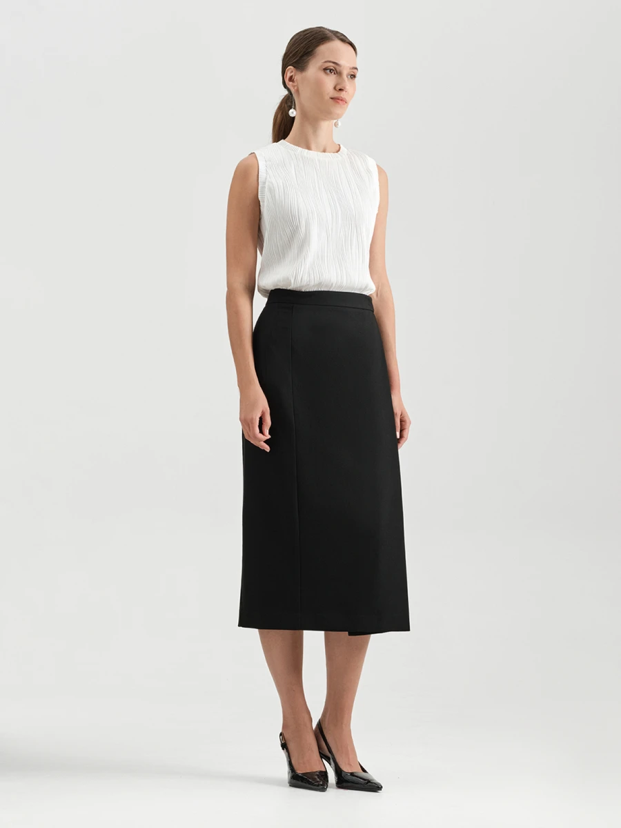 Мастхэв любого базового гардероба для повседневных и деловых образов - черная юбка в длине миди. Модель выполнена из высококачественной плотной ткани. Высокая посадка на талии подчеркивает фигуру и создает гармоничные пропорции. Спереди проходит элегантный разрез с запахом. По всему изделию проходят вертикальные строчки: в союзе с прямым кроем изделия они визуально вытягивают и стройнят силуэт.