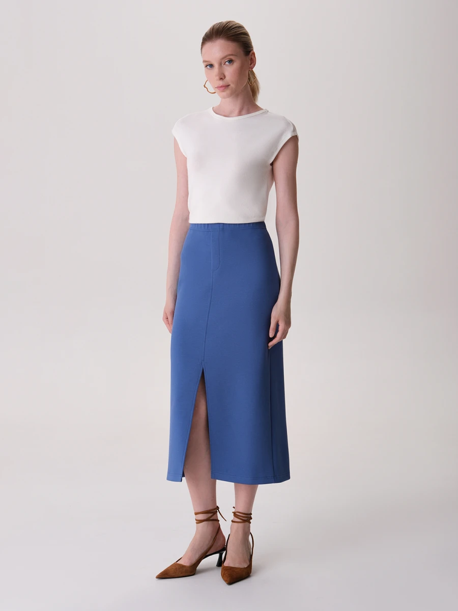 Однотонная трикотажная юбка в спокойном голубом оттенке станет идеальной основой для женственных уютных образов. Элегантная длина миди и глубокий разрез до середины бедра подчеркивают изящество щиколотк и демонстрируют красоту и длину ног. Высокая посадка на талии оснащена эластичной резинкой для максимального комфорта при носке. На задней части изделия расположены вместительные функциональные карманы, что делает модель ещё более практичной.