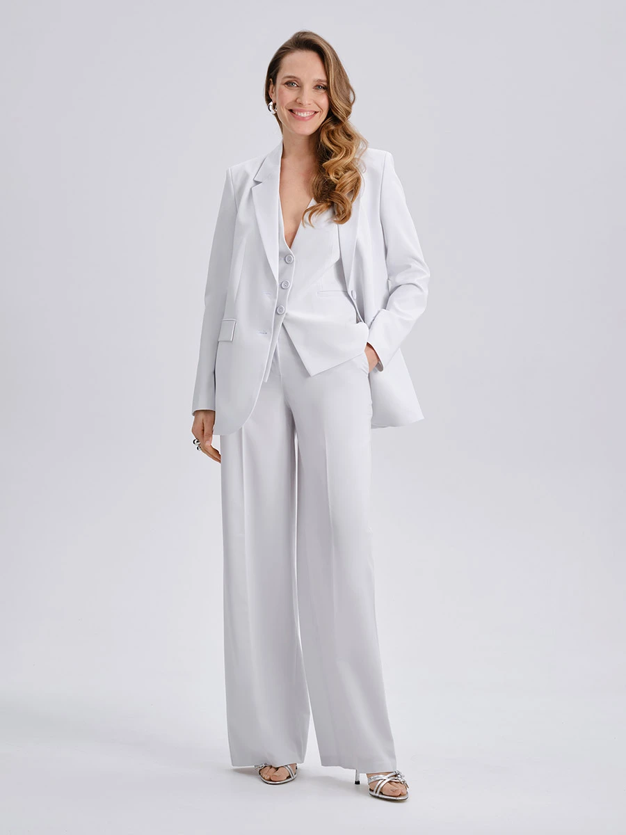Однобортный женский жакет голубого оттенка — элегантная интерпретация классического пиджака в современном прочтении. Прямой силуэт с подчёркнутыми плечами и чёткими линиями создает уверенный, собранный образ. Лаконичные лацканы, застёжка на две пуговицы и прорезные клапаны карманов добавляют строгости, сохраняя при этом актуальность и универсальность. Удлинённый крой позволяет комбинировать жакет с различными элементами гардероба — от классических брюк до джинсов или юбок.¶¶Изделие выполнено из комбинированной ткани с высоким содержанием полиэстера и добавлением вискозы и эластана. Материал приятен на ощупь, устойчив к сминанию и сохраняет форму даже при активной носке. Эластан обеспечивает лёгкую эластичность и комфорт при движении. Этот жакет станет надёжной основой для создания деловых образов, а также прекрасно впишется в более расслабленные сочетания с футболками или топами.