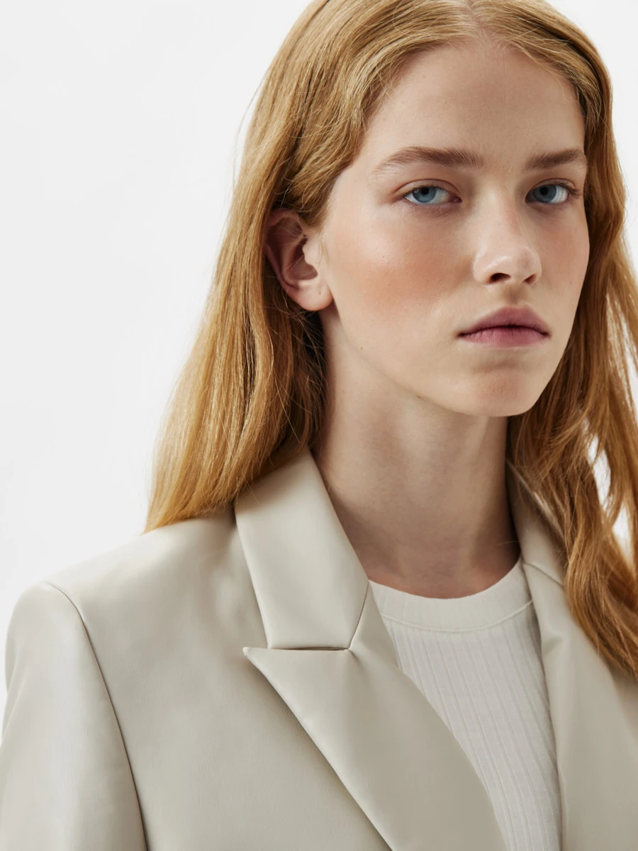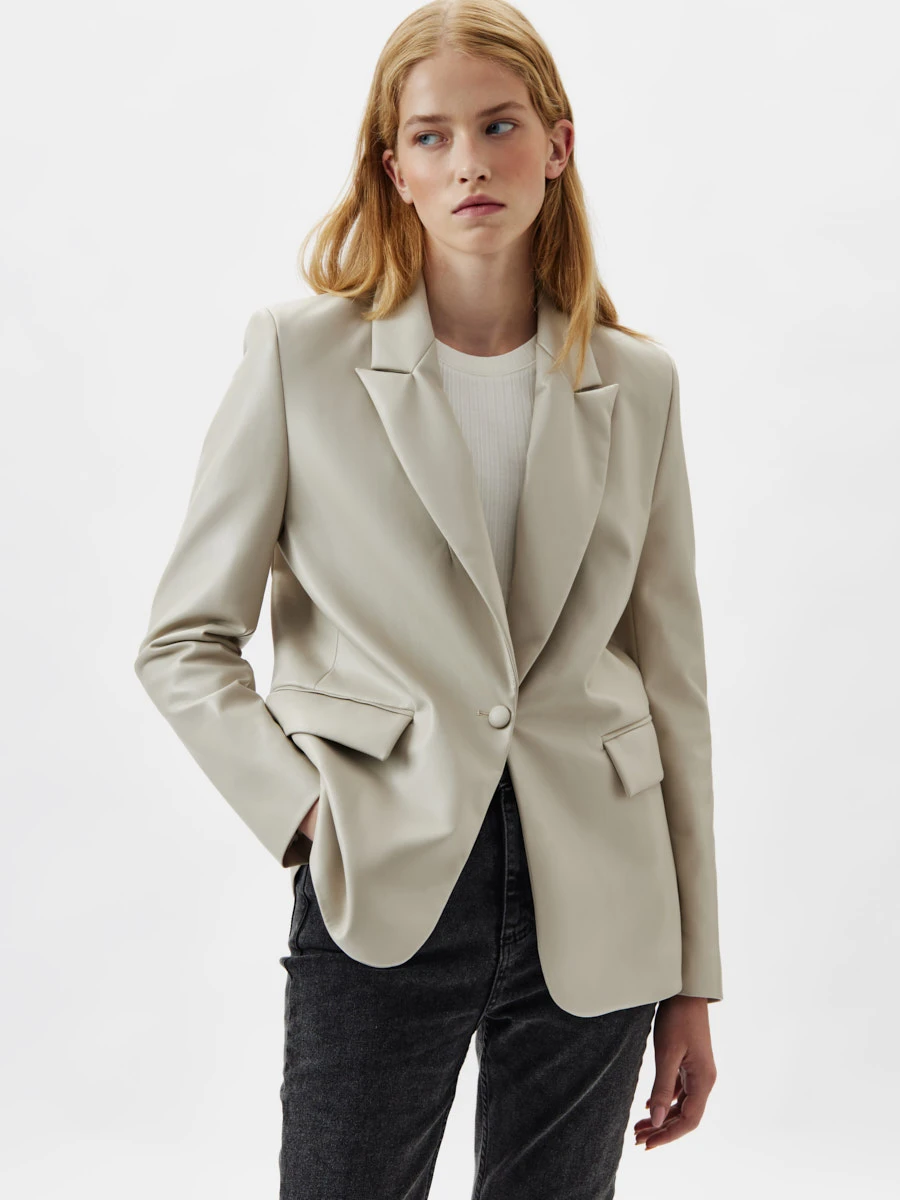 Однобортный жакет на подкладке. Выполнен из экокожи бежевого цвета.
