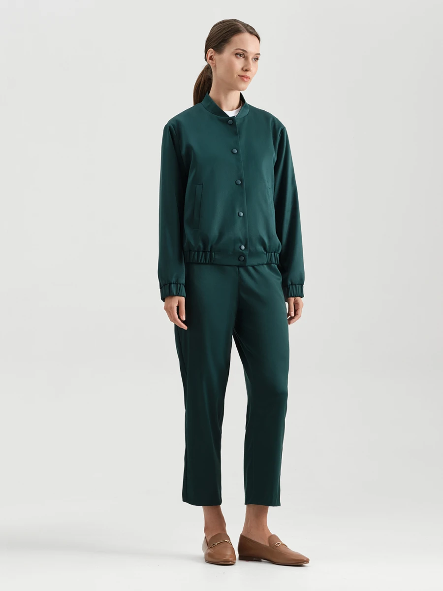 Стильный однотонный бомбер свободного кроя в роскошном изумрудном оттенке. Модель выполнена из потной ткани премиального качества и имеет дорогой деликатный блеск. Застегивается на круглые крупные пуговицы. Спереди расположены вместительные функциональные карманы, а объемные рукава и низ изделия оснащены эластичной резинкой. Аккуратный воротник-стойка дополняет изделие и защищает шею от ветра.