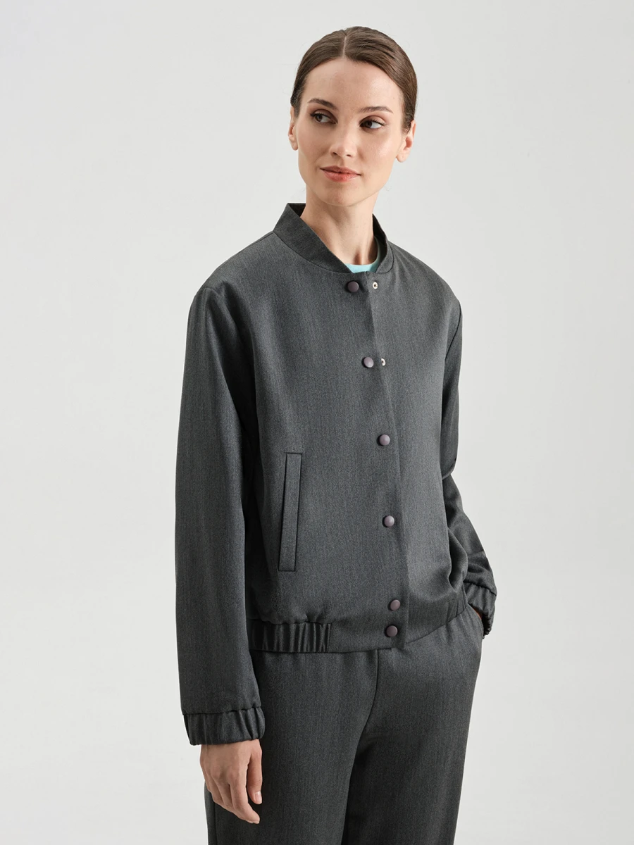 Стильный однотонный бомбер oversize кроя в спокойном сером оттенке. Модель станет отличным дополнением повседневных образов в прохладную погоду. Эластичные вставки на рукавах и по низу изделия защищают от порывов ветра. Спереди имеются функциональные карманы, расположенные под углом для максимального удобства. Застежка осуществляется на ряд кнопок с объемными круглыми пуговицами.