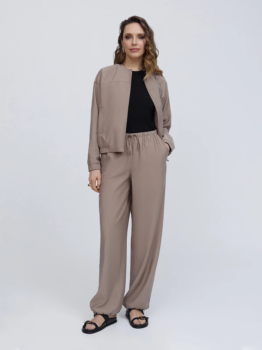 Бомбер из легкой ткани, в составе которой 89% модала, он придает материалу мягкость и шелковистость. Бомбер дополнен двумя боковыми карманами, без воротника, со спущенным плечевым швом. Пояс на резинке, застежка на молнии.